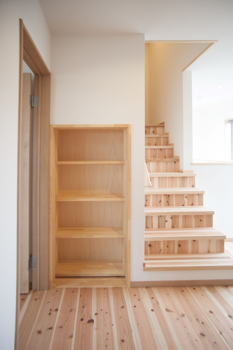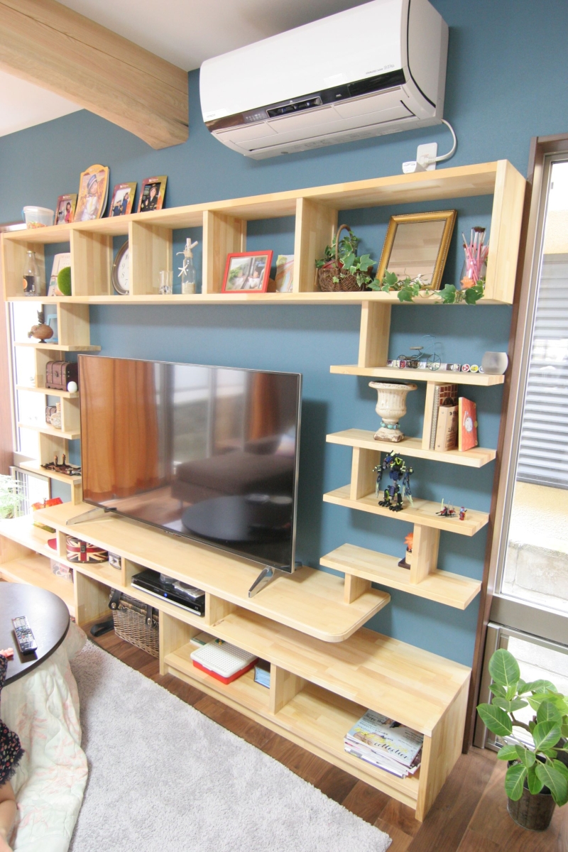 階段やテレビ台なども大工の手作りで仕上げ、木の温かみを感じるお家となりました。