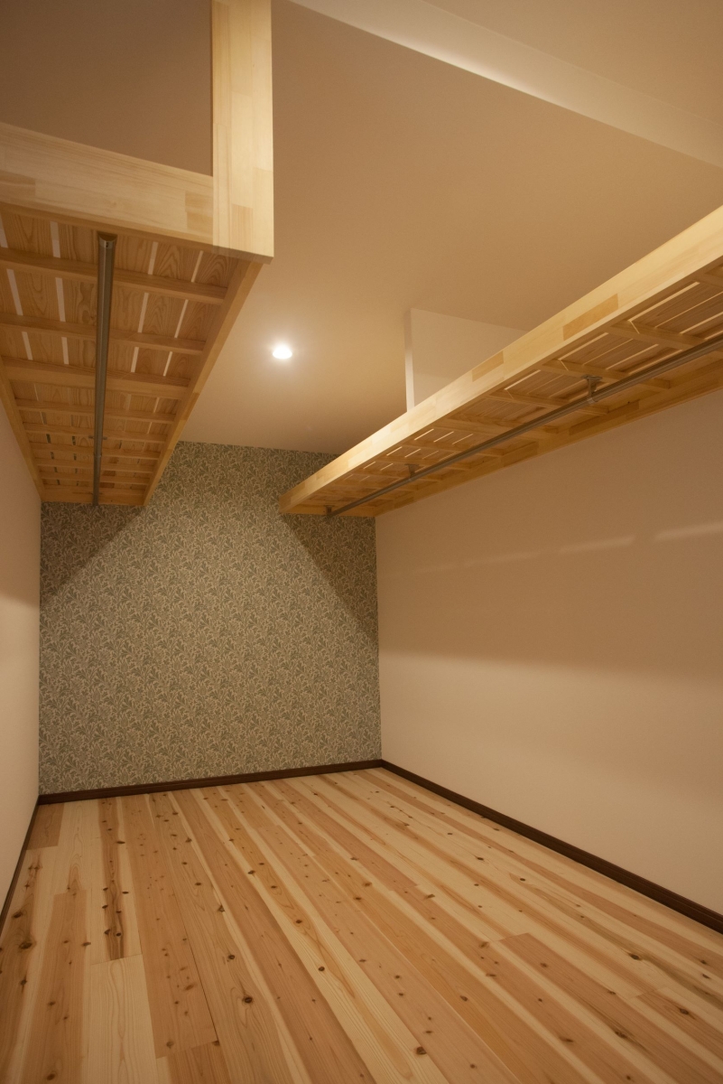 丸太梁を使うことで大きな空間を確保し、広いリビング横には、家族全員の服をしまえる大きなファミリークローゼットを配置しました。