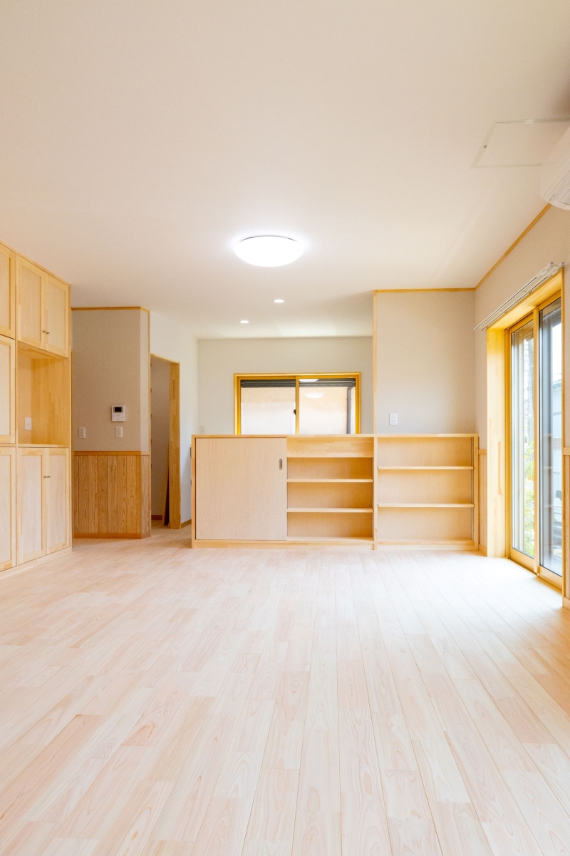 部屋をなるべくスッキリさせたいということで、リビングやキッチン前には造作家具を造り付けました。