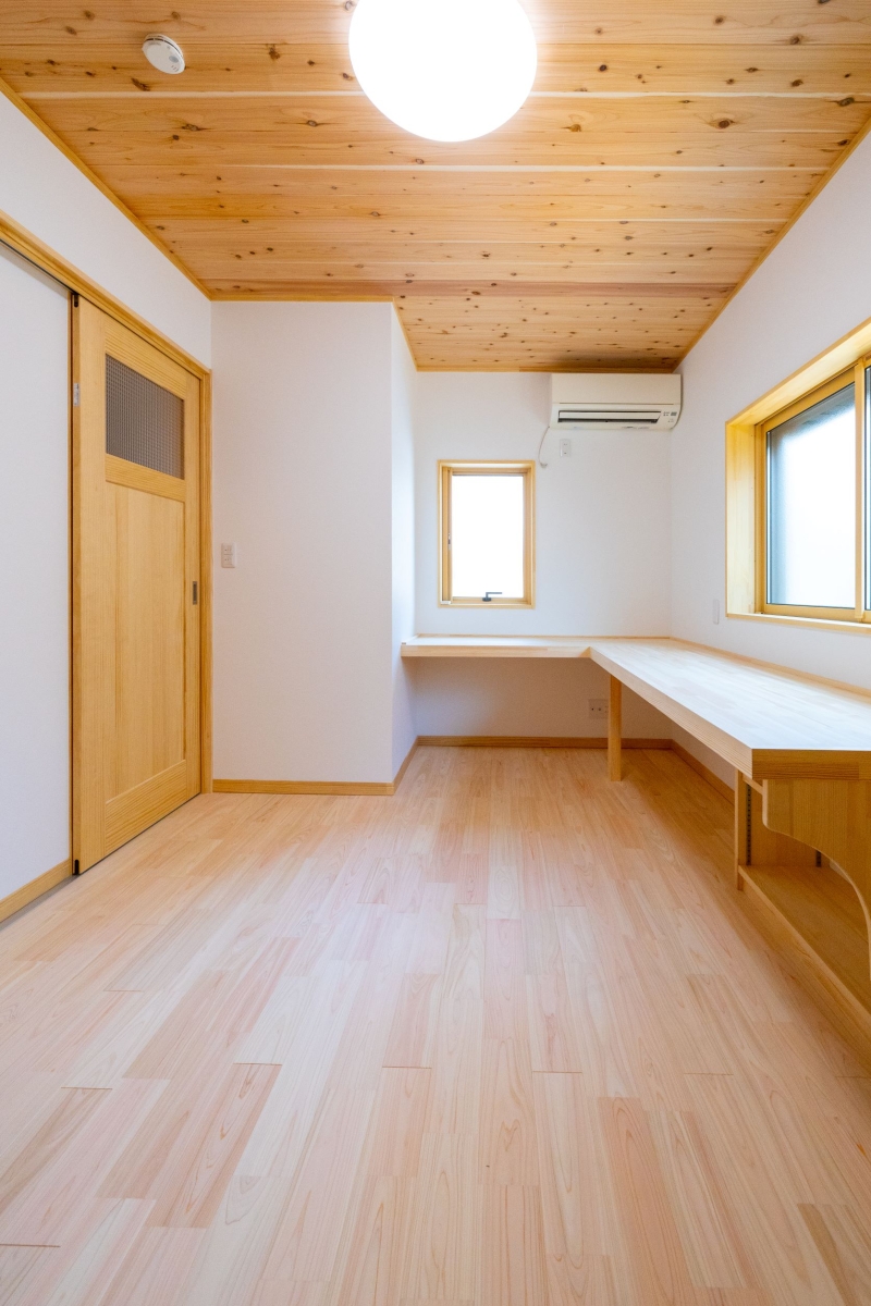 仕様は、“木心”で1階には桧のフローリングと、珪藻土仕上げと、一部の天井に杉を張り、2階の各居室は、桜のフローリングで仕上げました。