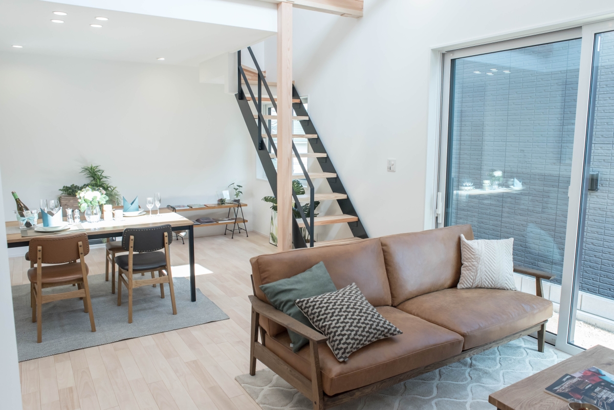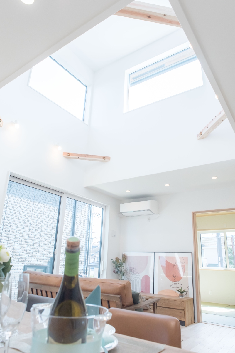 リビングに設けた吹き抜けから心地の良い陽射しが入り込む、爽やかな空間が広がる家。
