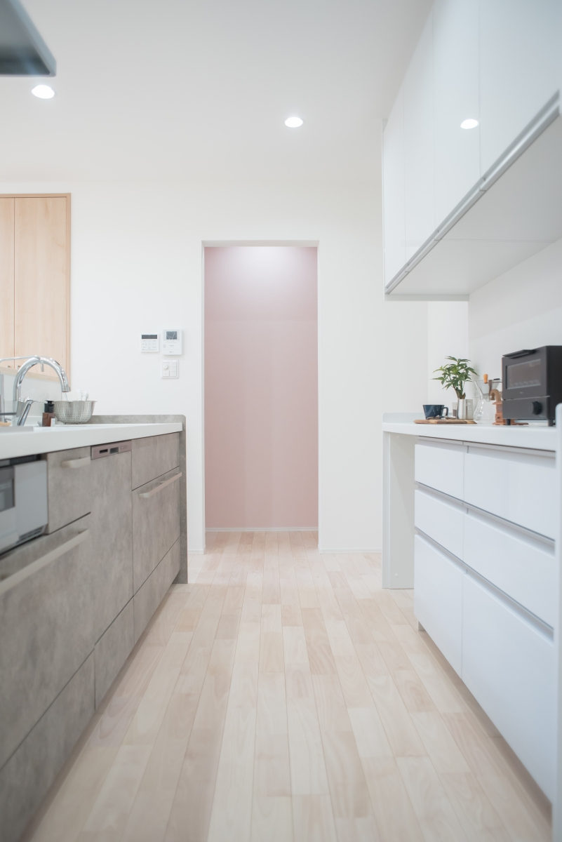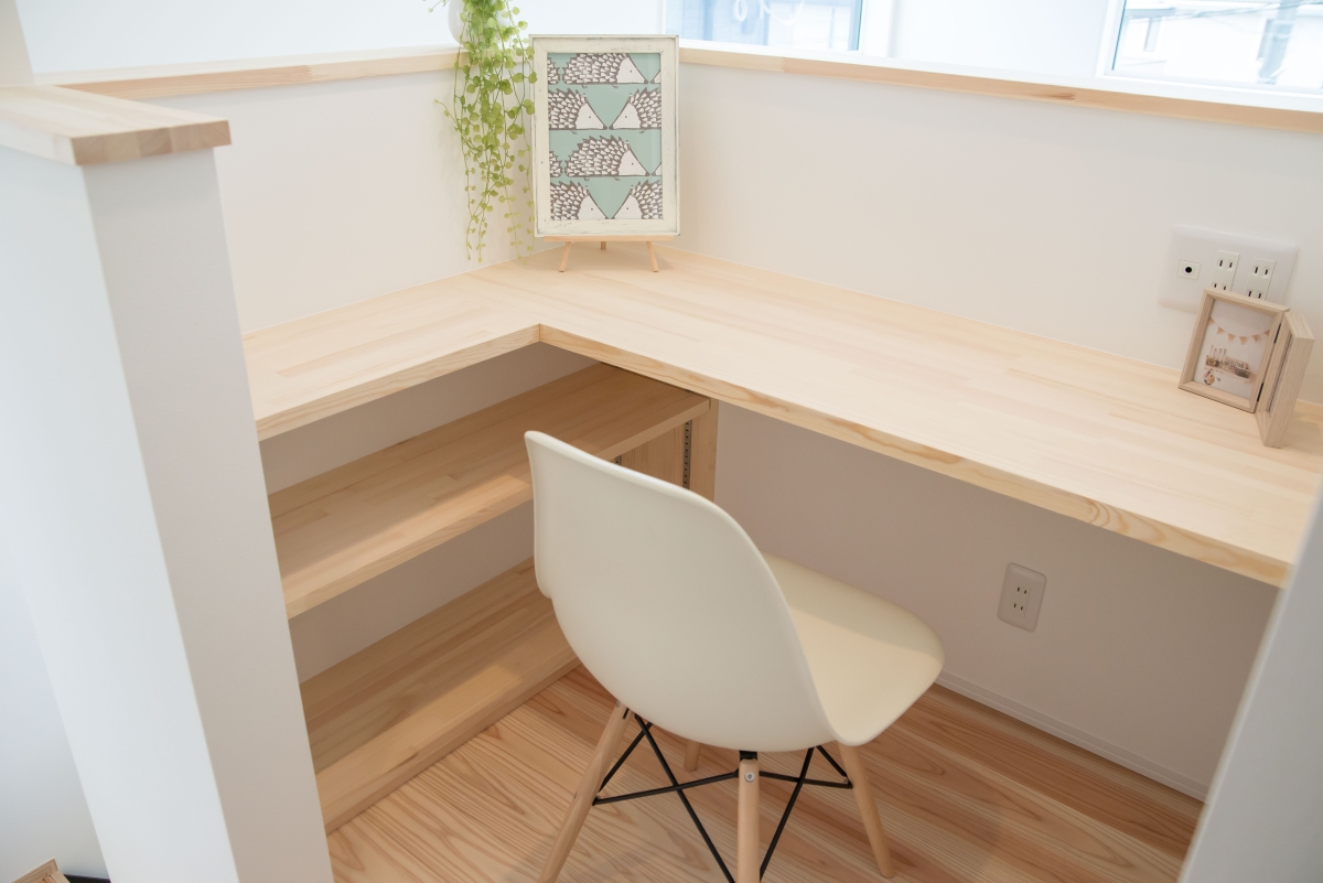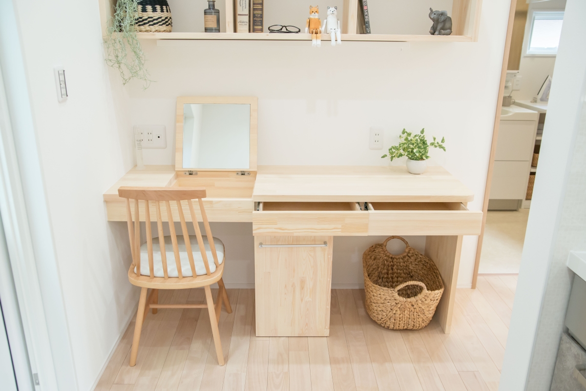 キッチン横には、奥様こだわりのスタディースペースと化粧台を兼ねた造作家具を。熟練の職人の確かな技術で仕上げた、木の温かみを感じるデスクです。家事をしながらふとお気に入りが目に入る幸せを日常に感じられます。