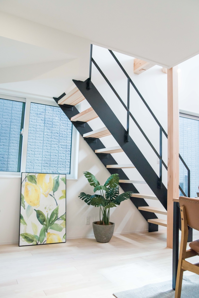 リビングの顔となるアイアン階段は、踏み板だけのスケルトンスタイルで。オープンに上下階をつなぐため、明るい光が降り注ぐ階段下のスペースも有効に活用できます。