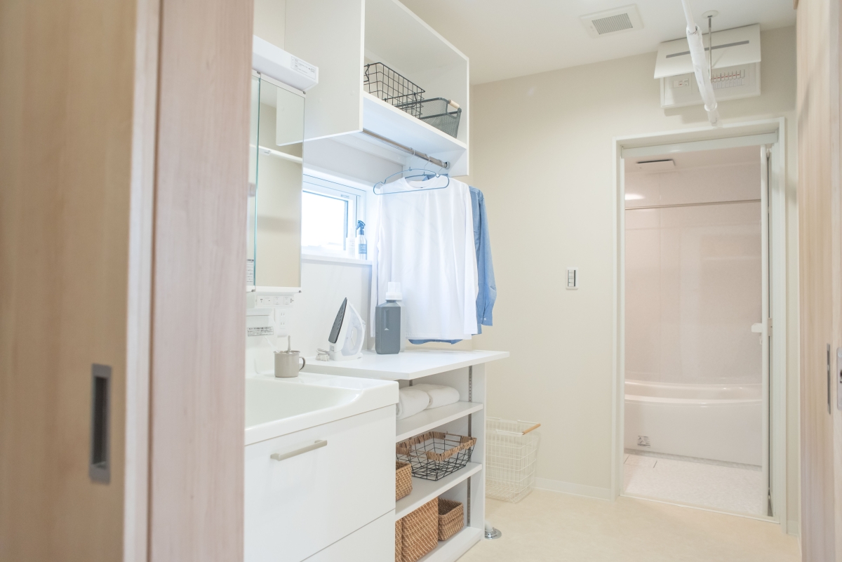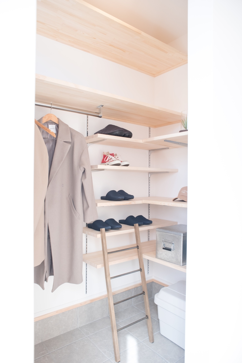 フルワークでお忙しいご家族。脱衣所兼ランドリールームの隣には、家族分の衣類などがしまえる広々としたファミリークロークを設けることで洗濯物の片付けの手間がぐっと時短に。家事動線や使いやすさを重視した収納もしっかり考えられているので、効率よく家事を行えます。