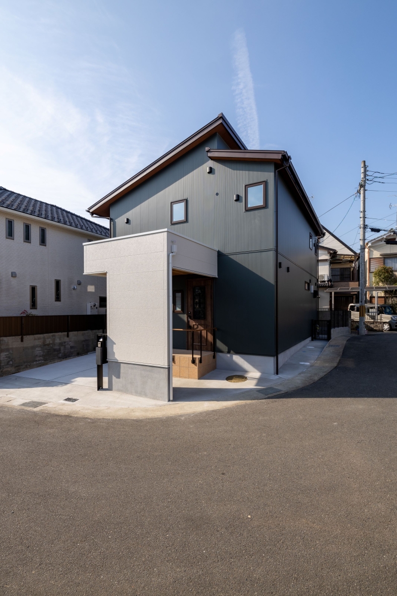 外観は、落ち着いた風景にすっと馴染むモスグリーンのガルバリウム鋼板。