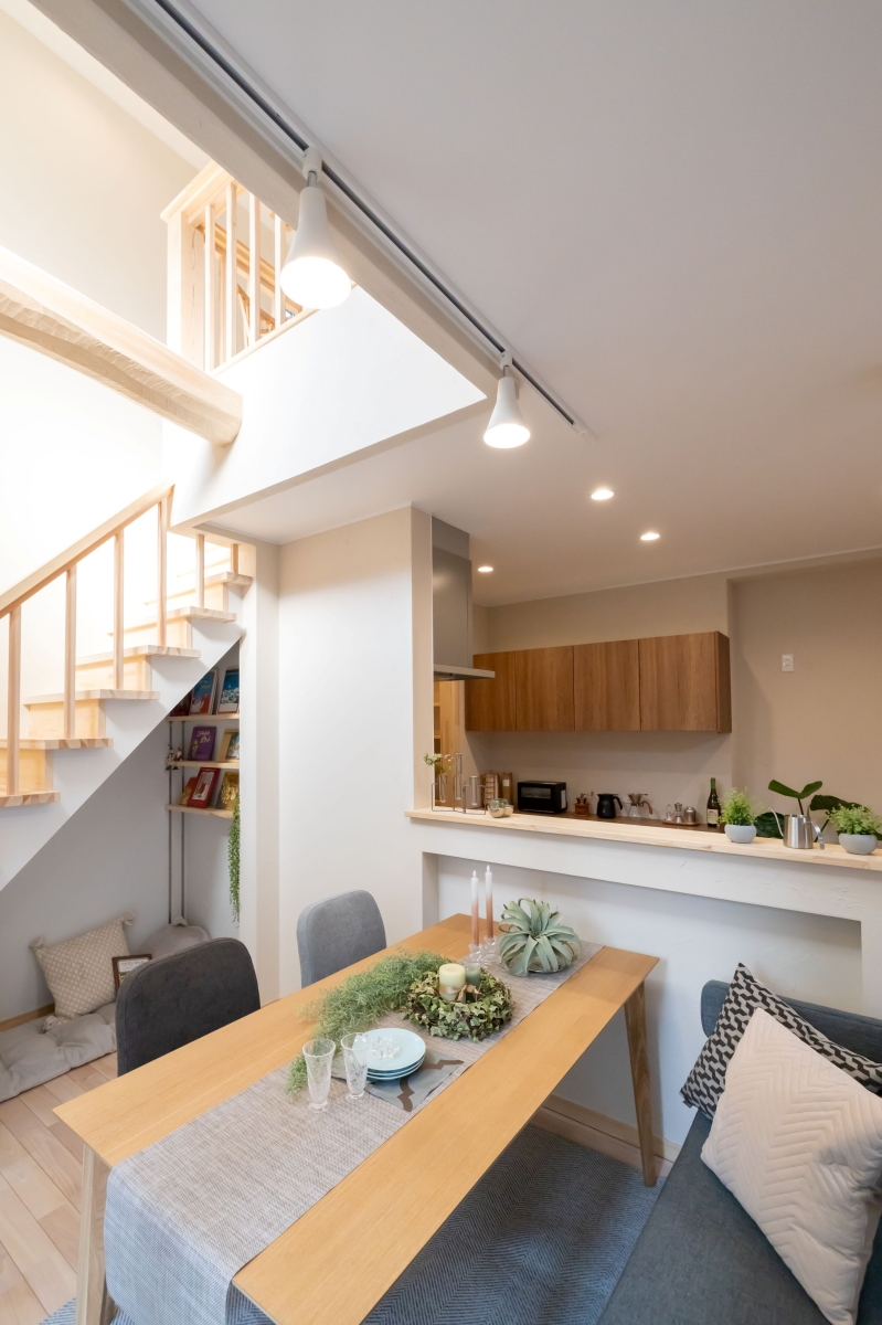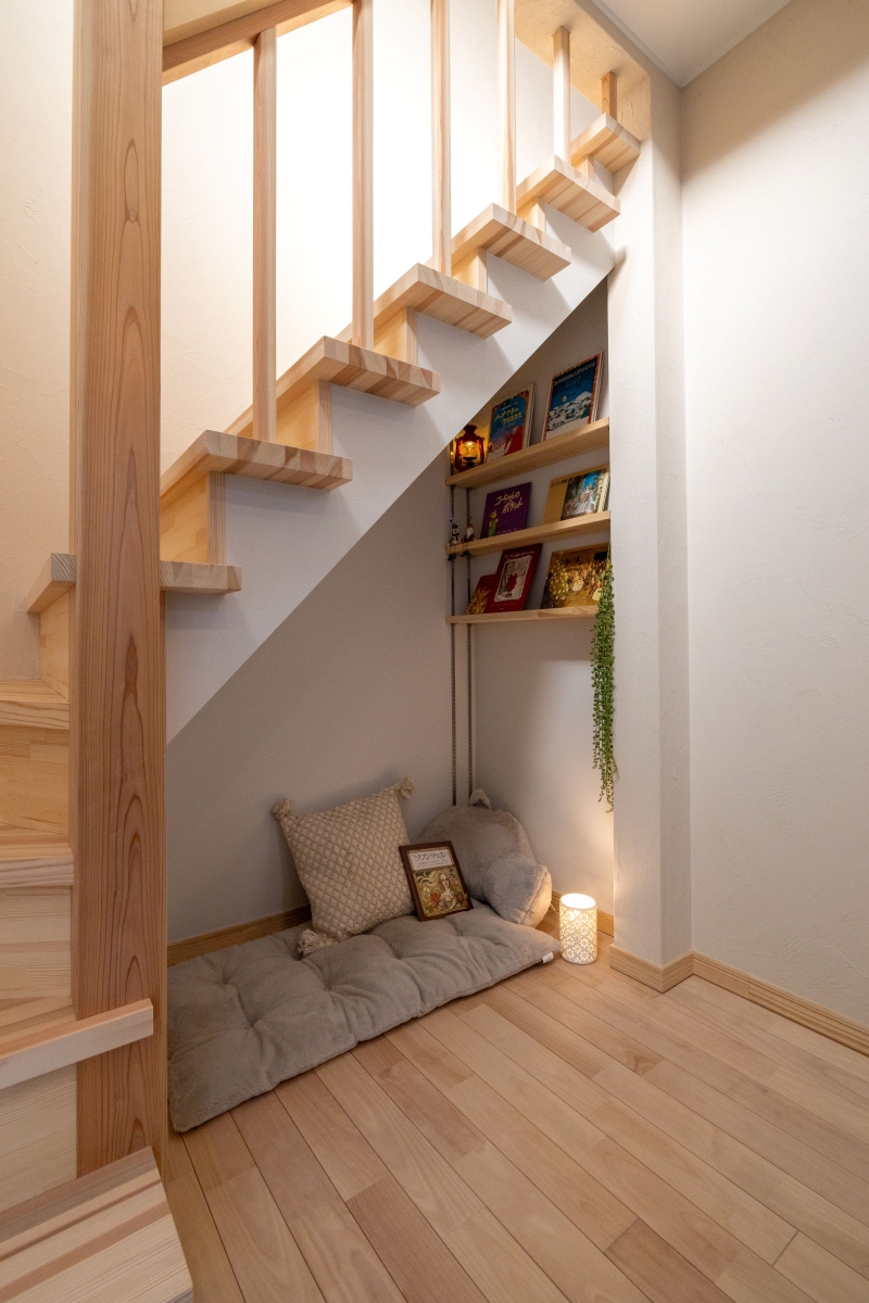 階段下にはヌックを設け、小さな読書スペースや“秘密基地”のように使える遊び心ある空間に。
