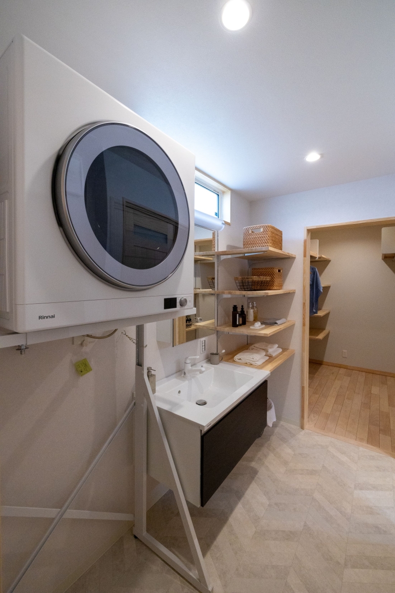 洗面脱衣室には衣類乾燥機を設置し、干す・しまうの手間を軽減。