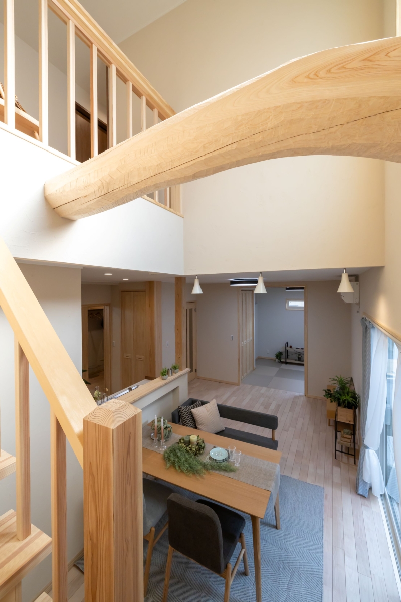家の中心には8寸角の大黒柱。圧倒的な存在感を持ちつつも、木のやわらかな風合いが、家族の時間にあたたかく寄り添います。